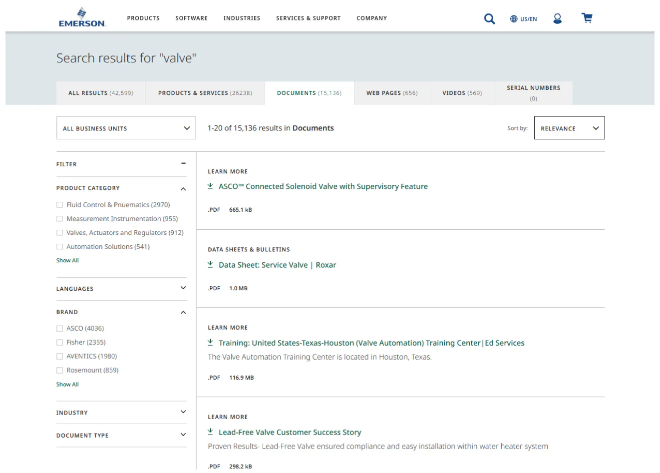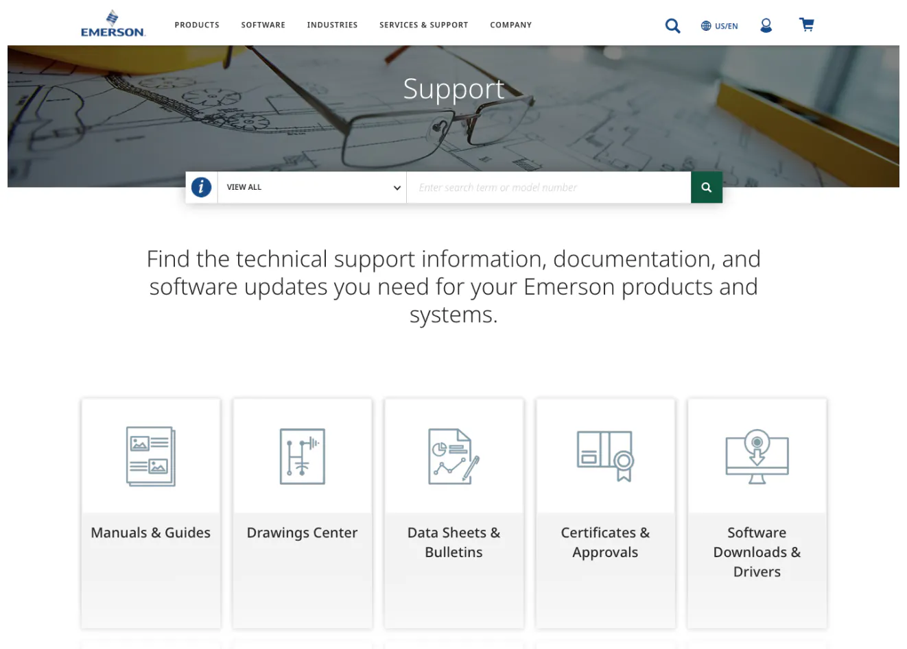 The bulk of the content is technical documentation stored in PDF files, easily downloadable straight from the search results. But the Emerson help center goes beyond that, also providing access to collaborative engineering tools, drivers’ downloads, and order tracking.