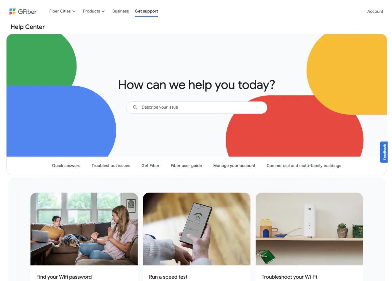 Search is front and center, as you’d expect from Google, which helps reach the right answers quickly. The level of organization on the homepage also makes navigation easier. Speed test and Wi-Fi troubleshooting are the things people come to this website for most often, so they’re featured prominently, without having to look for them in FAQs or sub-menus. Contact options are also clearly visible and serve all avenues (email, chat and phone) with a scheduling option. Simple questions are answered in the comprehensive FAQ at the bottom of the page, while the rest of the content is organized in the top navigation bar.