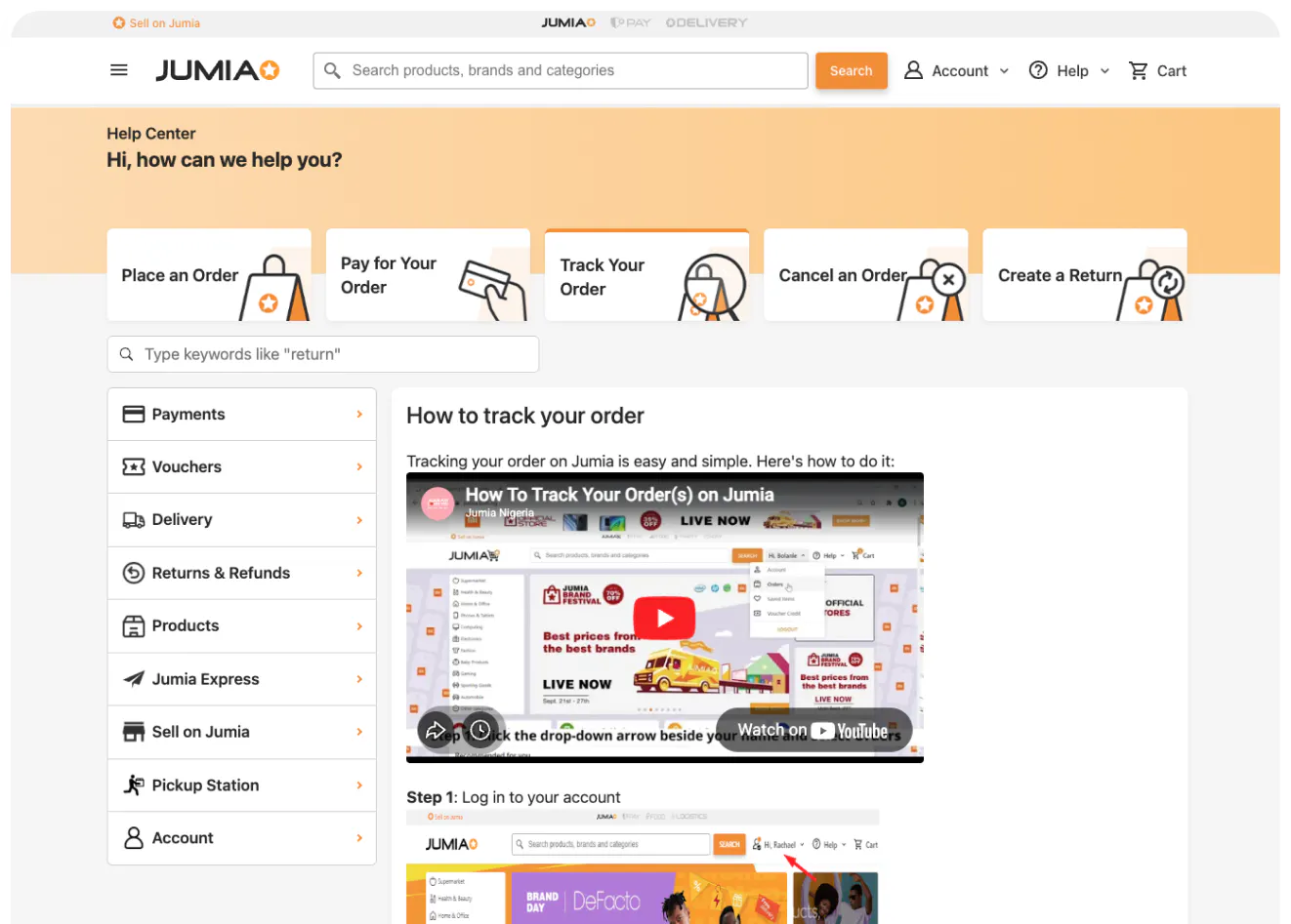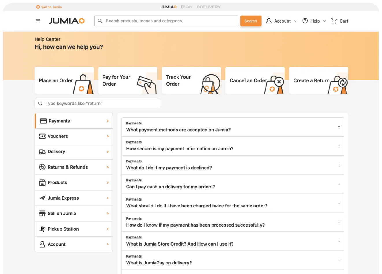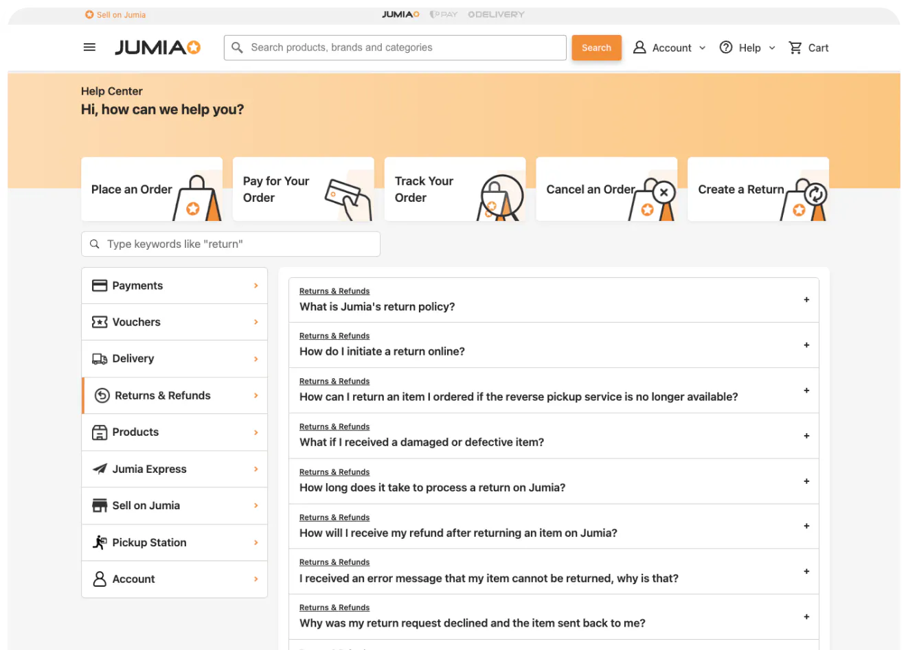 Jumia operates at a significant scale, serving customers across multiple regions and product categories. Its help center is structured around the shopping lifecycle, with clear sections for orders, returns and refunds, payments, delivery and account management.