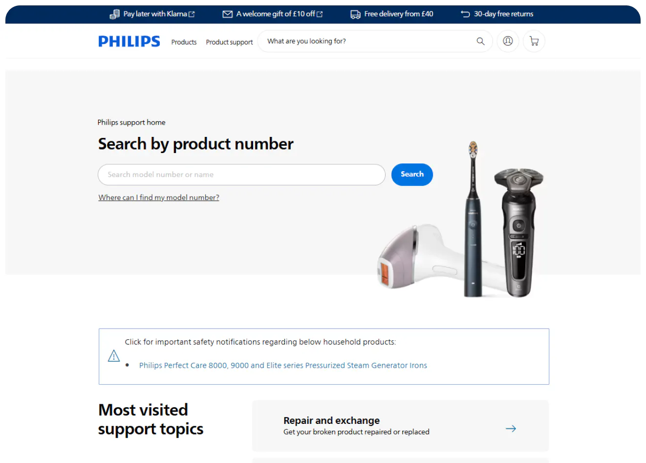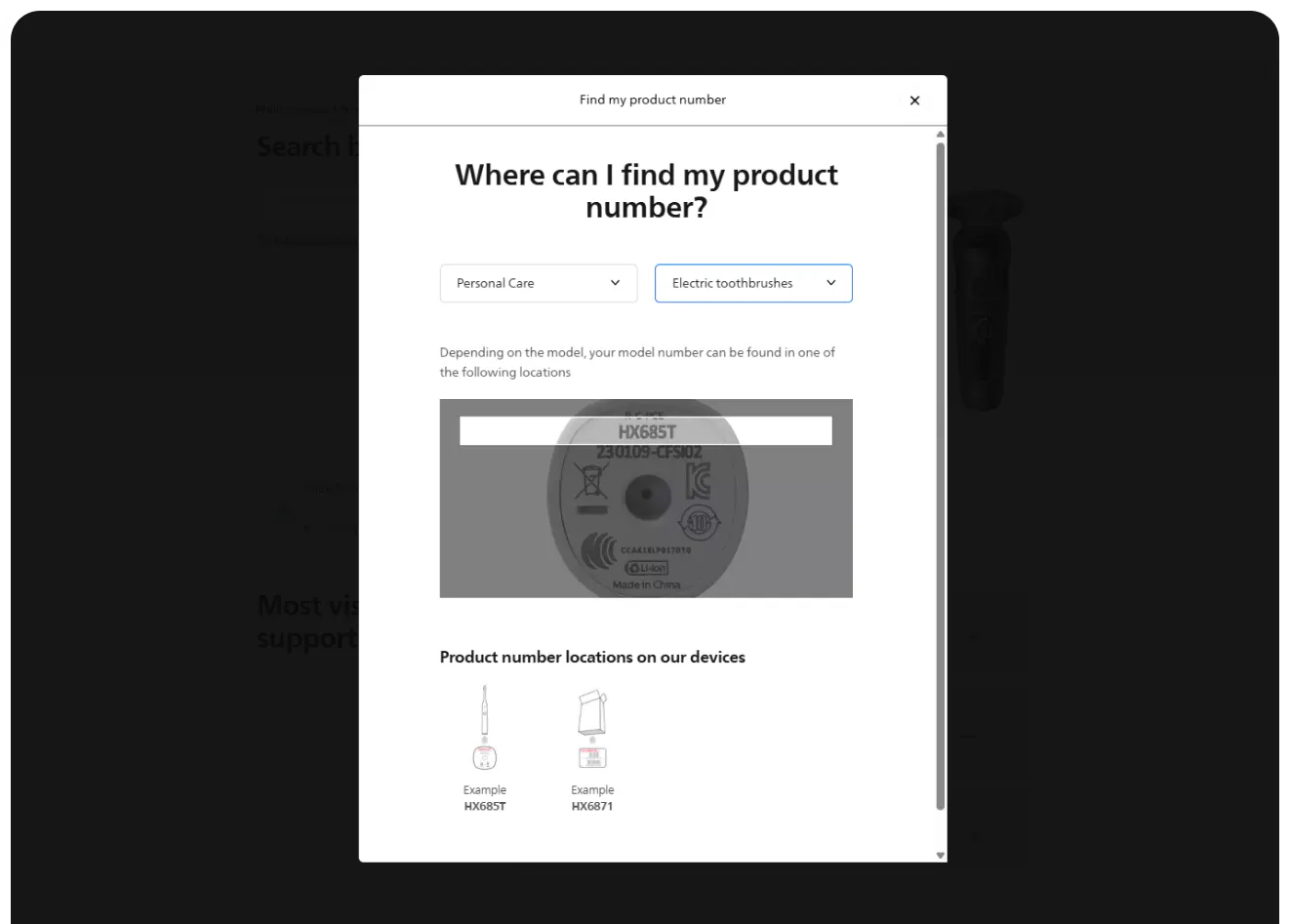 The entire help center is organized around finding particular products. But that requires the customer to actually know what product they have, and Philips recognizes this is not a small ask. After all, who knows by heart the exact model of their toothbrush or vacuum cleaner? So the help center lets you search by product number and provides visual instructions for where to find it. If that doesn’t help, you can also search by name. And beyond that, there’s always an option to simply click through the product categories until you find the right model. Philips does not leave you stranded.