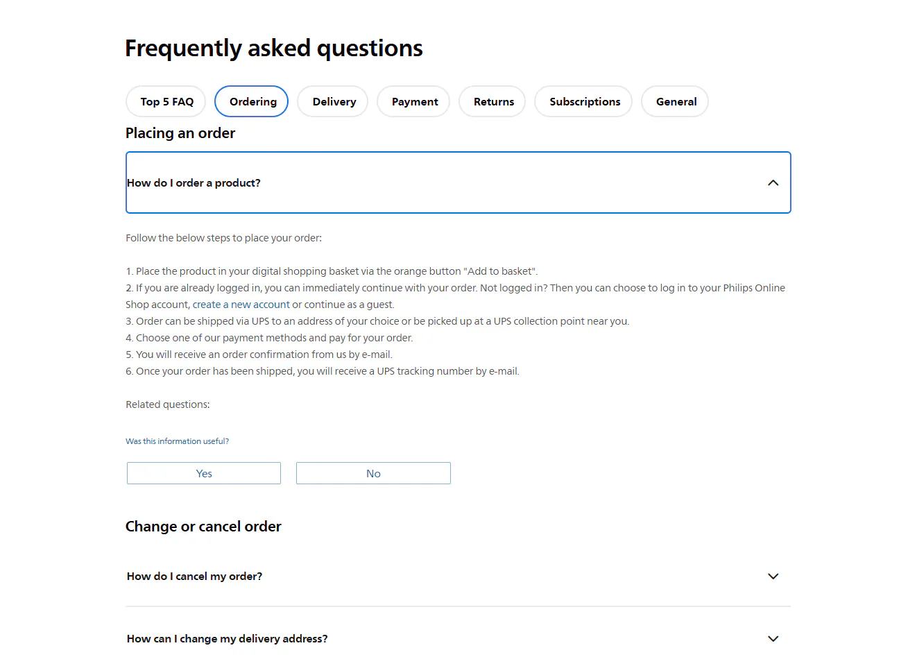 Rather than standard articles, Philips help center has product pages, each with lots of valuable information about warranty, repairs and replacements. The pages have a clean, tabulated design so you never get lost in the detail. For each product, you can download the full user manual, look up frequently asked questions or check the basic troubleshooting steps. You can also immediately order replacement parts or make a warranty claim, so the support goes far beyond just help content and into a smooth customer experience.