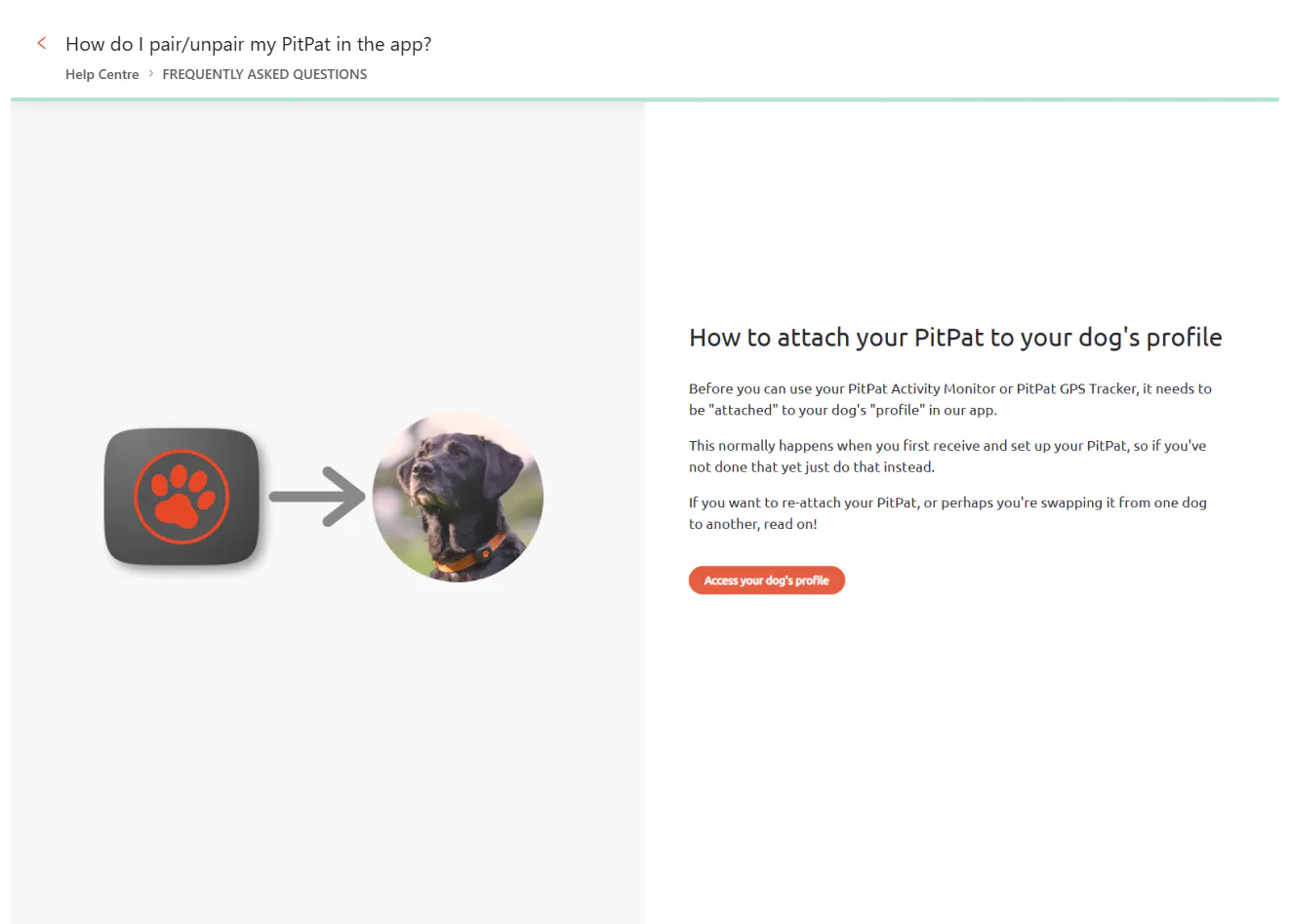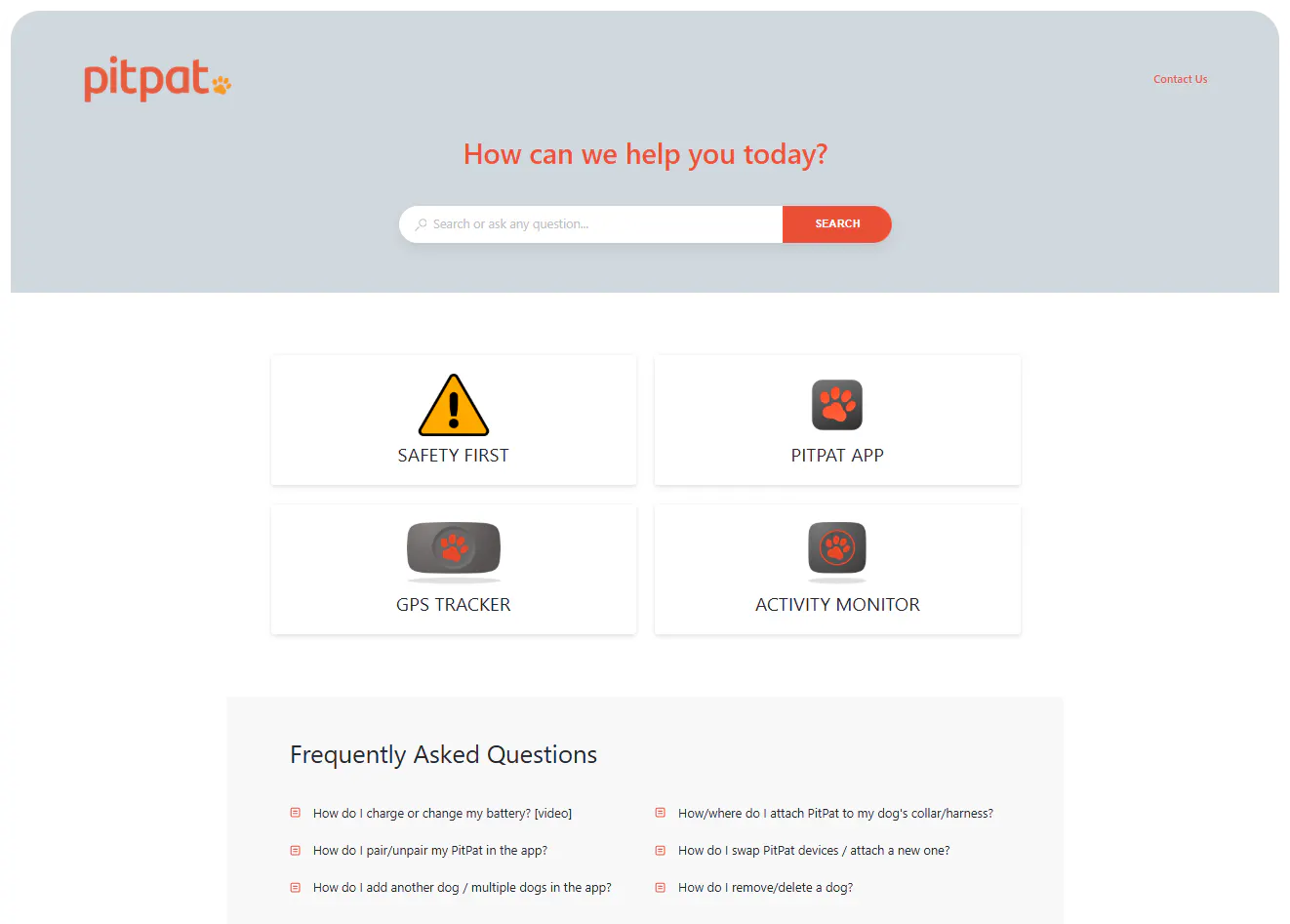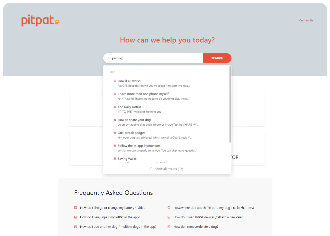 The help center is oriented around PitPat products: the GPS tracker, activity monitor and their app. The homepage is clean and compact with only four top-level categories, each expanding into more narrow subcategories, but it's search and FAQ sections that are the main ways to content discovery. Search is set up in an interesting way, taking advantage of the step-by-step format of content and all results linking to specific steps rather than entire guides. Full guides are served through the expansive FAQ, making sure that most users will find their answers immediately from the homepage.