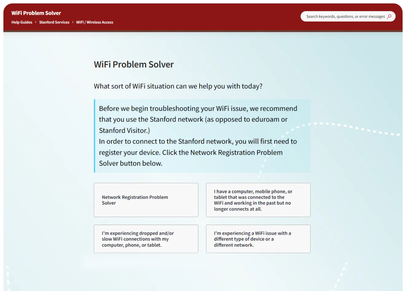 Stanford needs to offer its almost 20,000 students a wide range of technical resources and support, from basic device troubleshooting to detailed instructions for using the essential software. They do that with a knowledge base that’s compact and designed with a very broad audience in mind.