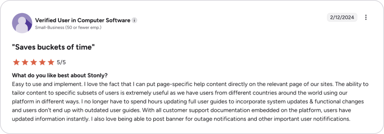 “Stonly's unique step-by-step format helps me create brief, clear, and relevant guidance for our most sophisticated customer scenarios.”