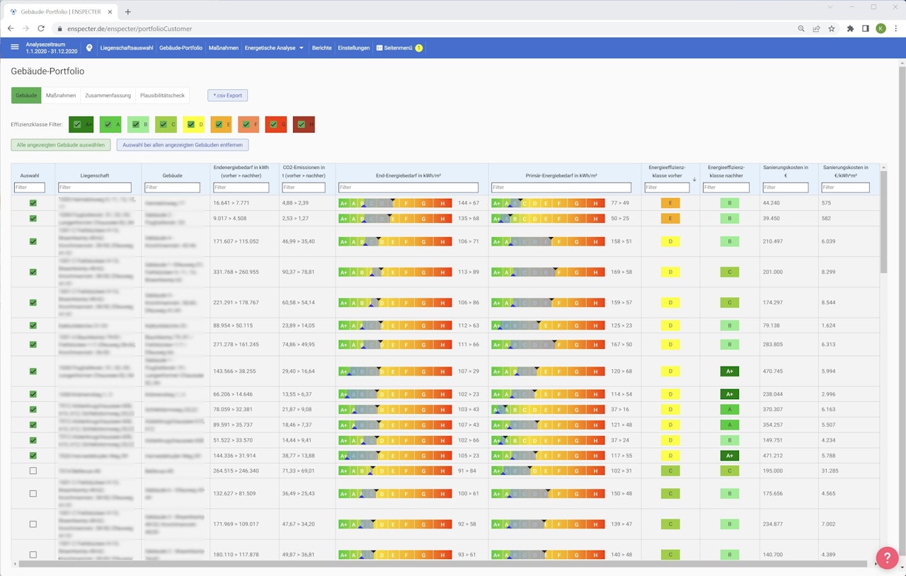 Aus den gesammelten und hochgeladenen Daten erstellt ENSPECTER Ihnen eine Portfolioübersicht. Hier werden die relevanten Daten zu allen Gebäuden im Bestand übersichtlich angezeigt. Wenn Ihnen eine Ansicht oder eine Zahl fehlt, können Sie das Portfolio bequem nach Excel exportieren und die Daten in einem Analysetool Ihrer Wahl weiter verarbeiten.