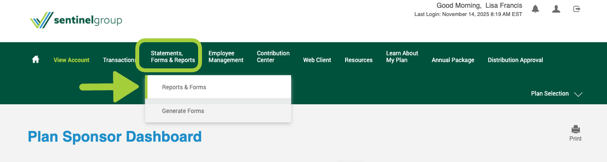 To download your plan's template census file, log in to your online retirement account at sentinelgroup.com and select Statements, Forms & Reports then Reports & Forms from the menu.