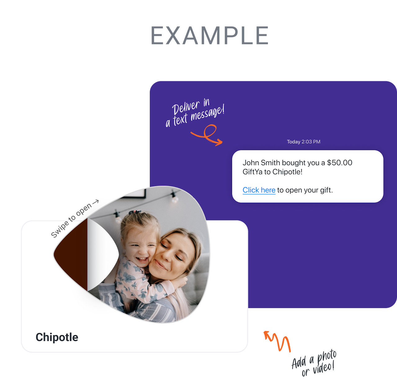 Use the GiftYa app or website to choose almost any merchant in the U.S., select a gift amount, add a photo or video, and deliver by text or email within seconds.