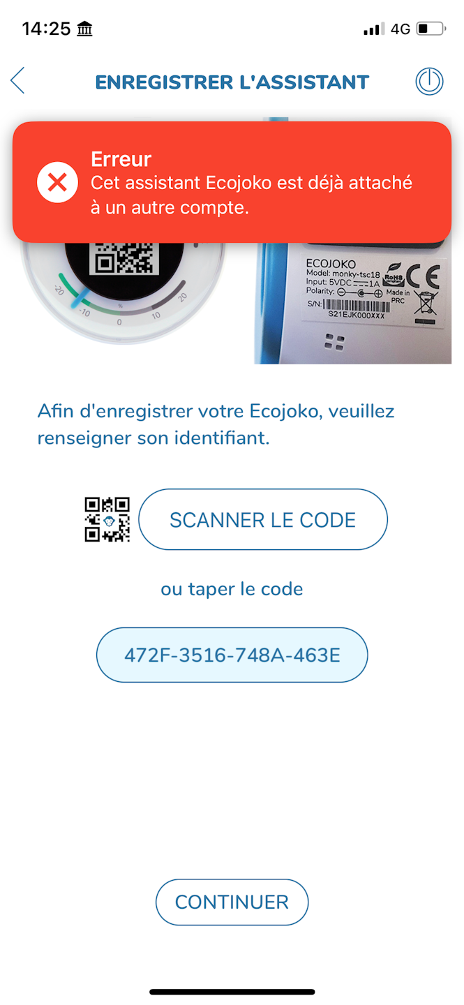 Nous allons vous poser quelques questions pour finaliser l'installation si le message d'erreur suivant apparaît. "Votre assistant est déjà rattaché à un autre compte".