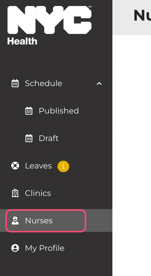 To update this kind of information of their behalf, first select "Nurses" from the lefthand navigation menu.