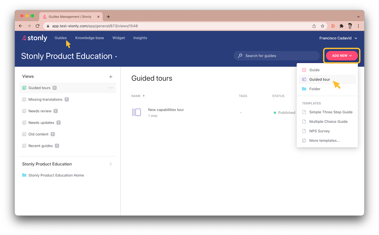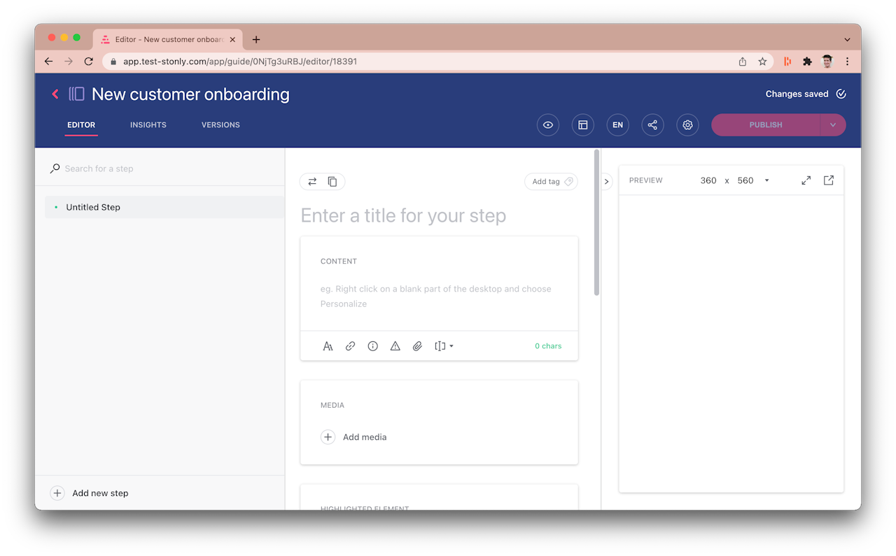 After naming it, the editor will open and you’ll see a blank guided tour, which has a very similar structure to a regular guide.