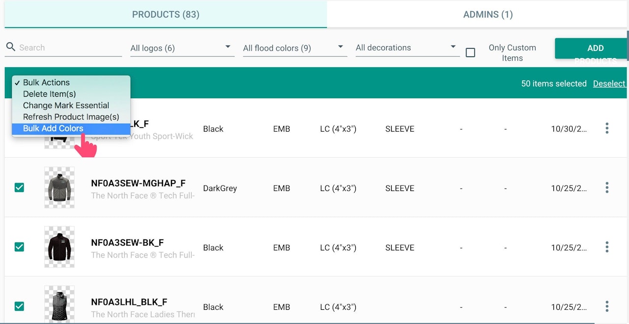 To get started select items already available in the store from products list in the Locker Manager details. The items you select should be the styles you wish to add additional colors in. You can select one or multiple styles all at once.