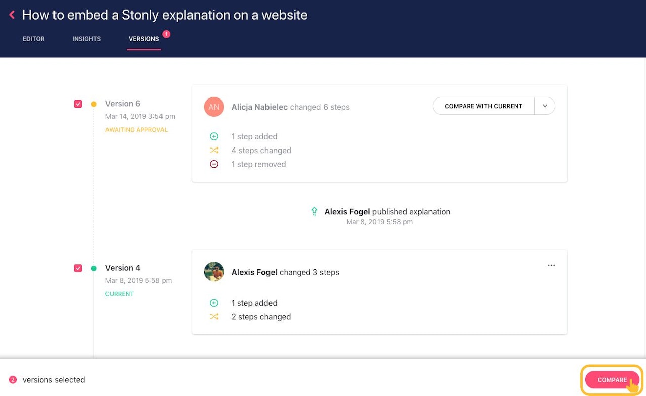 Select two versions you want to compare and click on the "Compare" button.
