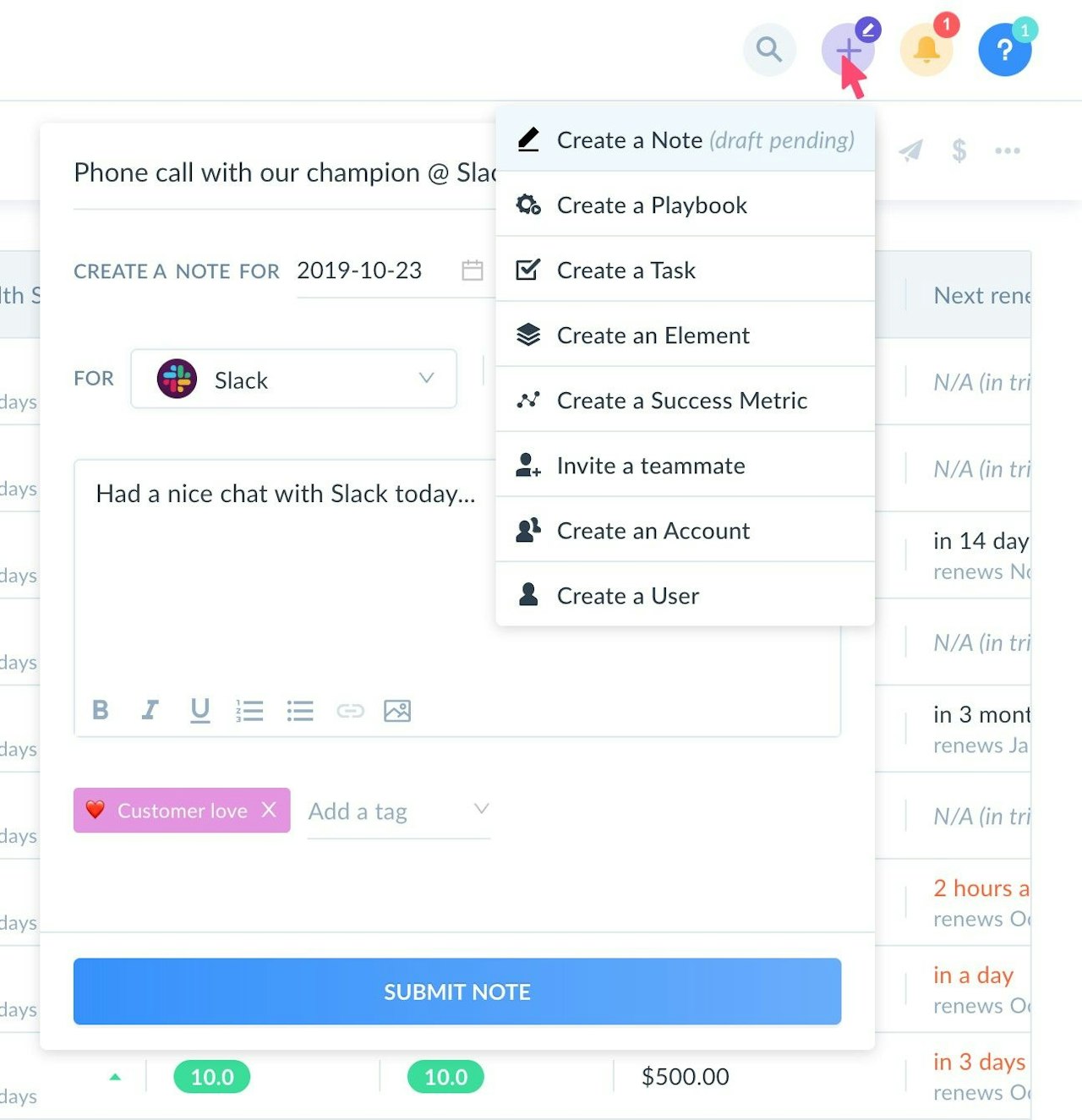 To leave a note for an account in Vitally, either click the purple + button in the top right, or use the "Tab + N" shortcut.