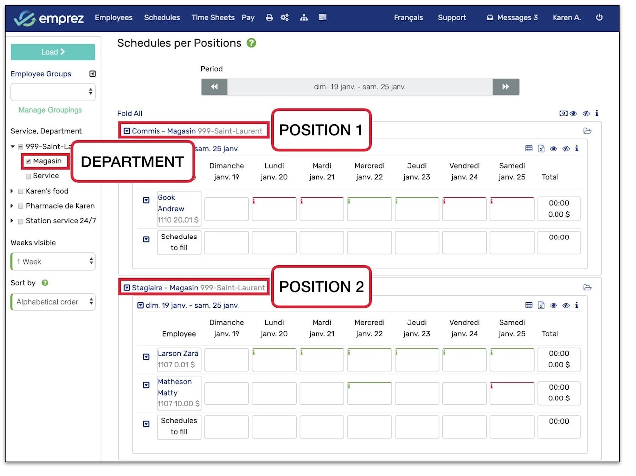 Emprez will display all positions related to a department, and all employees who can work that position.