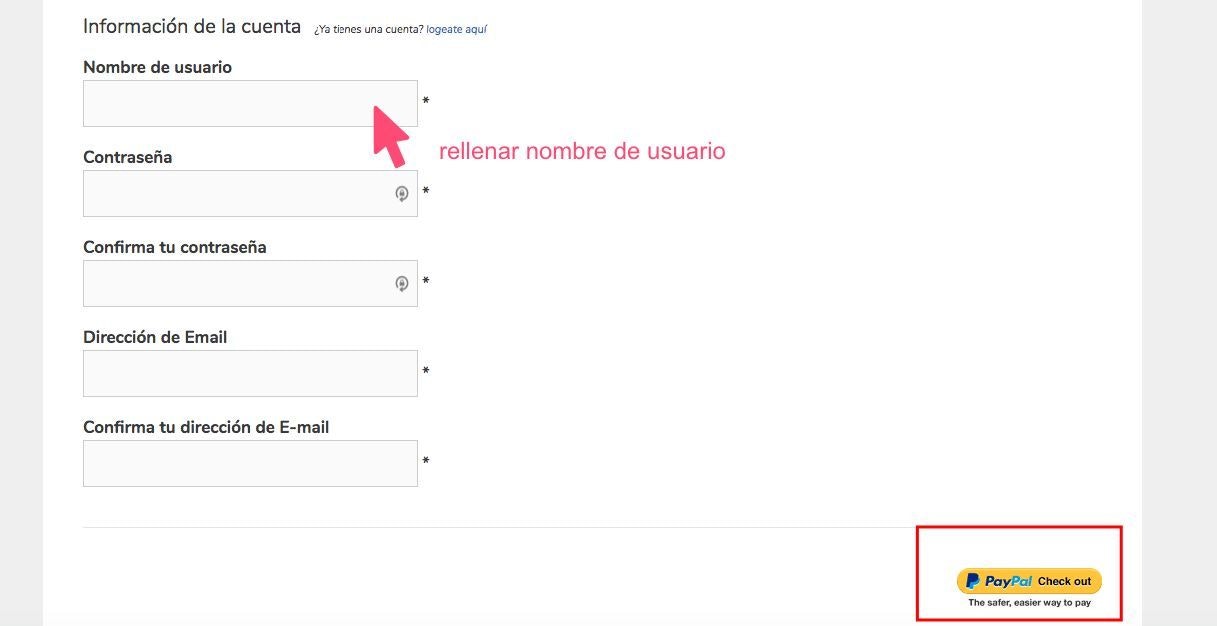 automáticamente desde Paypal. Para completar el registro debes rellenar este formulario con tus datos de usuario, email y una contraseña propia. Después la pasarela te llevará a la web de Paypal para que realices el pago seguro.