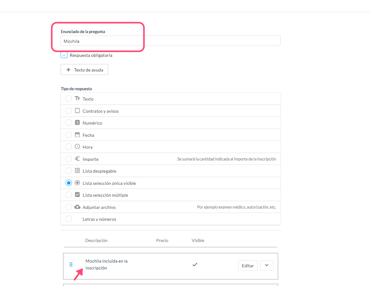 Si tu producto que va en el pack no lleva ninguna opción de respuesta, tenemos igualmente que configurarlo mediante una pregunta personalizada con la diferencia que en este caso únicamente llevará una respuesta con el nombre del producto. Ej: Mochila incluida en la inscripción.