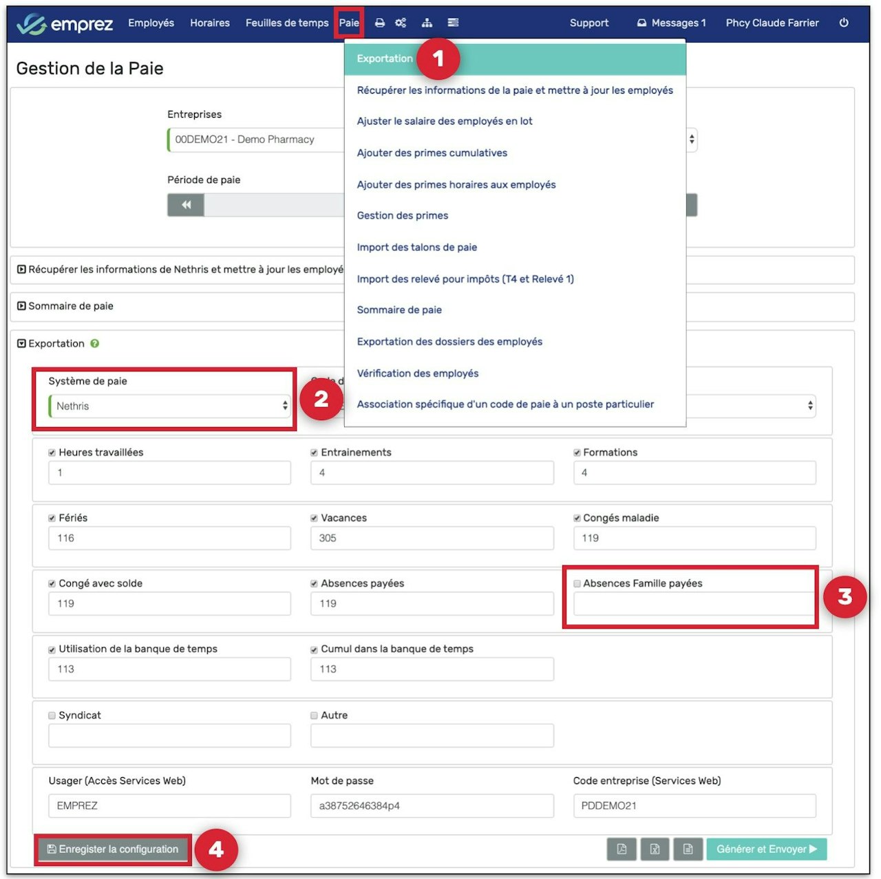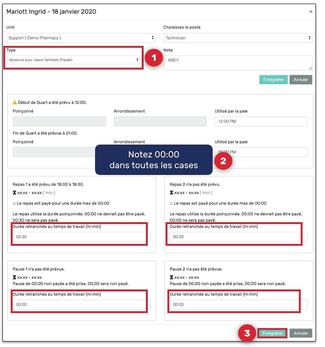 - Vérifiez que les cases repas et pauses sont vides (00:00)