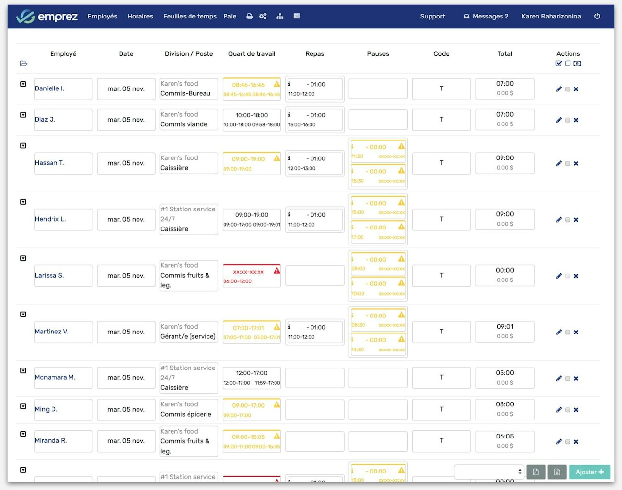 - L'heure de poinçonnage sera comparée à celui-ci et Emprez fera l'ajustement au fur et à mesure pour avoir le bon nombre d'heures à payer à l'employé