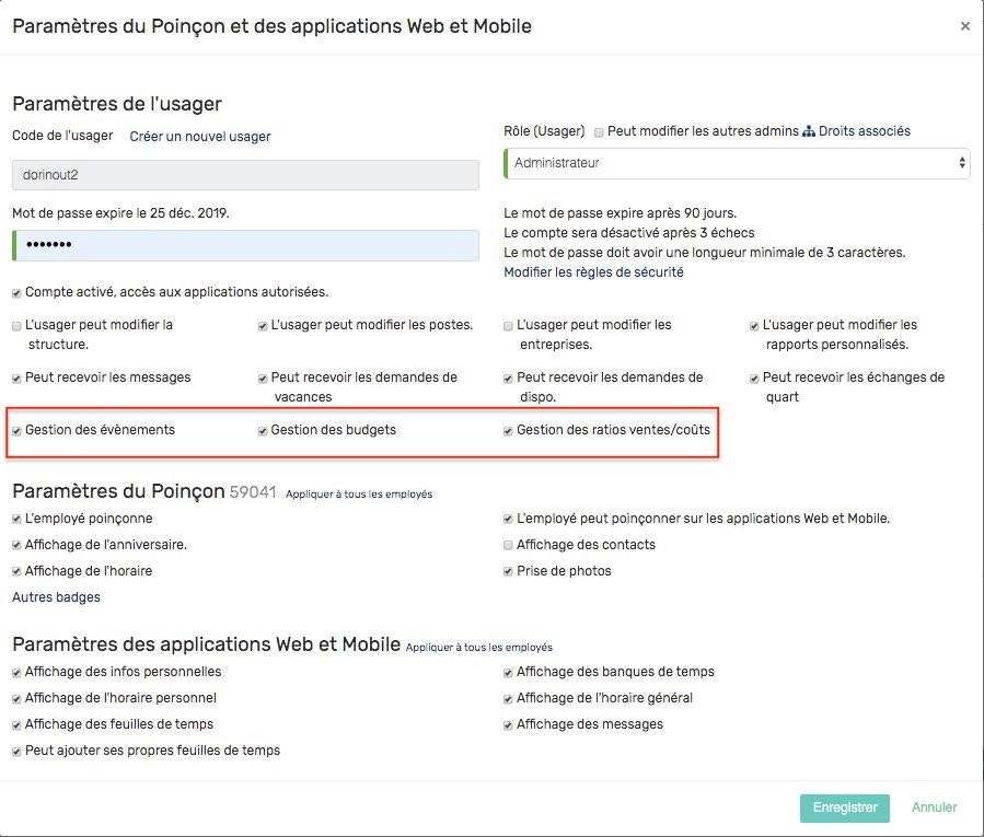 Dans ADMIN 14 (half God), accédez au profil du gestionnaire, cliquez sur Accès mobile et web, et activez les options voulues. Pour terminer, cliquez sur Enregistrer.