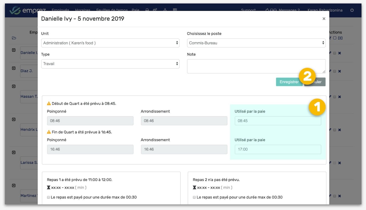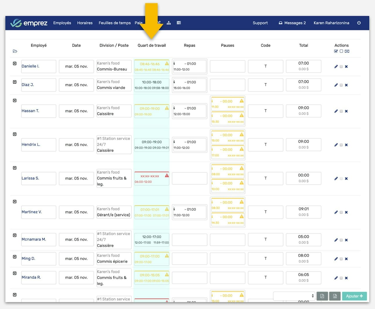 Quand la couleur de la feuille de temps est JAUNE => le début/fin poinçonné est différent de celui prévu à l'horaire. Les totaux d'heures sont à vérifier avant l'approbation.