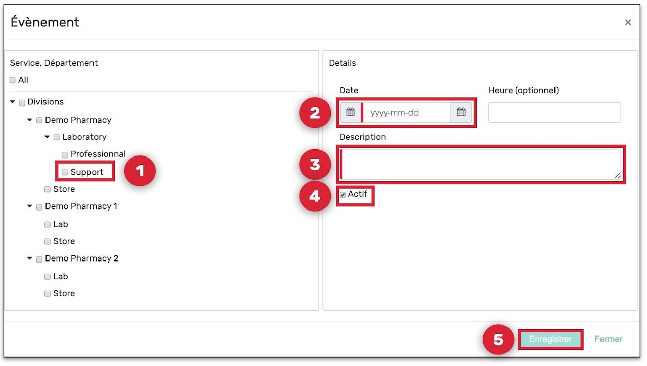 - Remplir les champs en rouge à la droite et choisir le(s)service(s)/départements concernés,