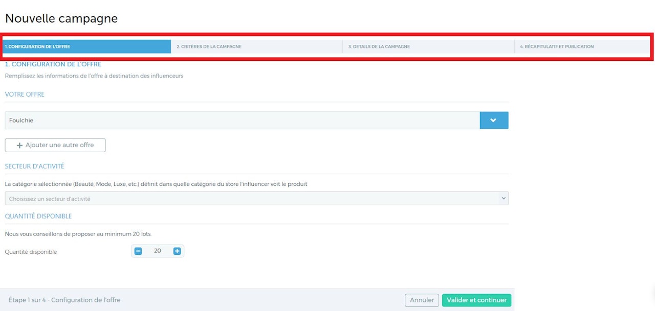 Dans un premier temps vous devez effectuer la configuration de l’offre: