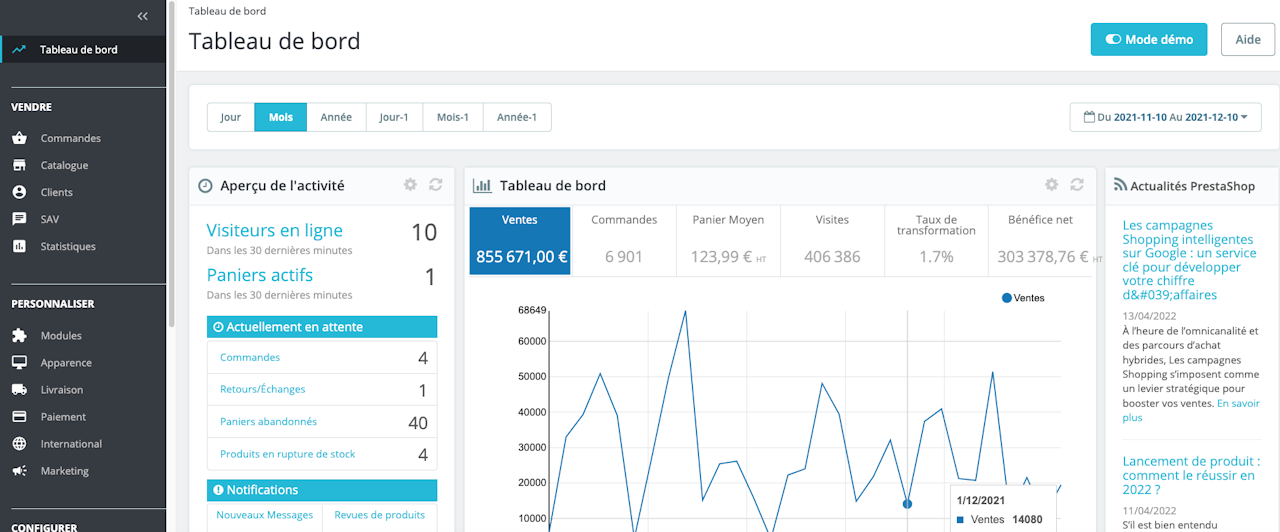 Une fois connecté vous vous trouvez sur le dashboard/tableau de bord administrateur de votre site Prestashop, qui doit ressembler à ça (cf image 2).