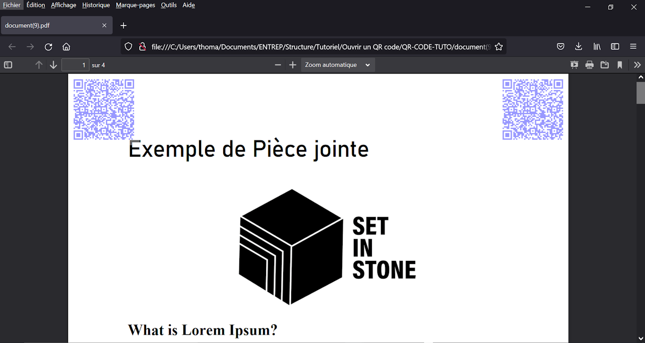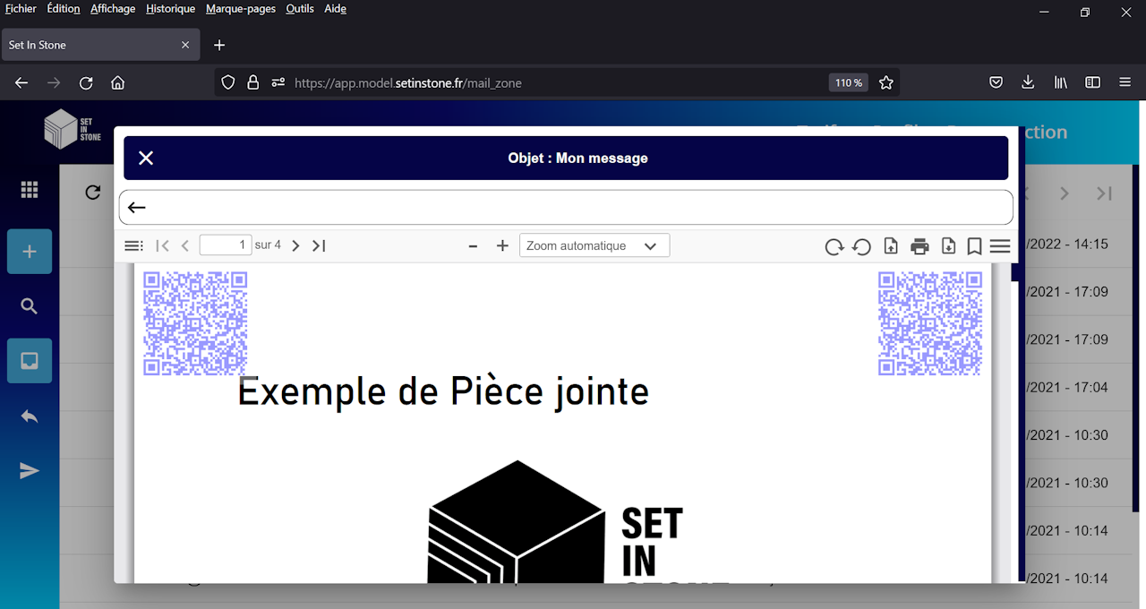 Chaque pièce jointe ouverte dans la plateforme de Set In Stone est frappée par des QR codes Set In Stone. Le QR code est imprimé 4 fois sur chaque page de la pièce jointe.