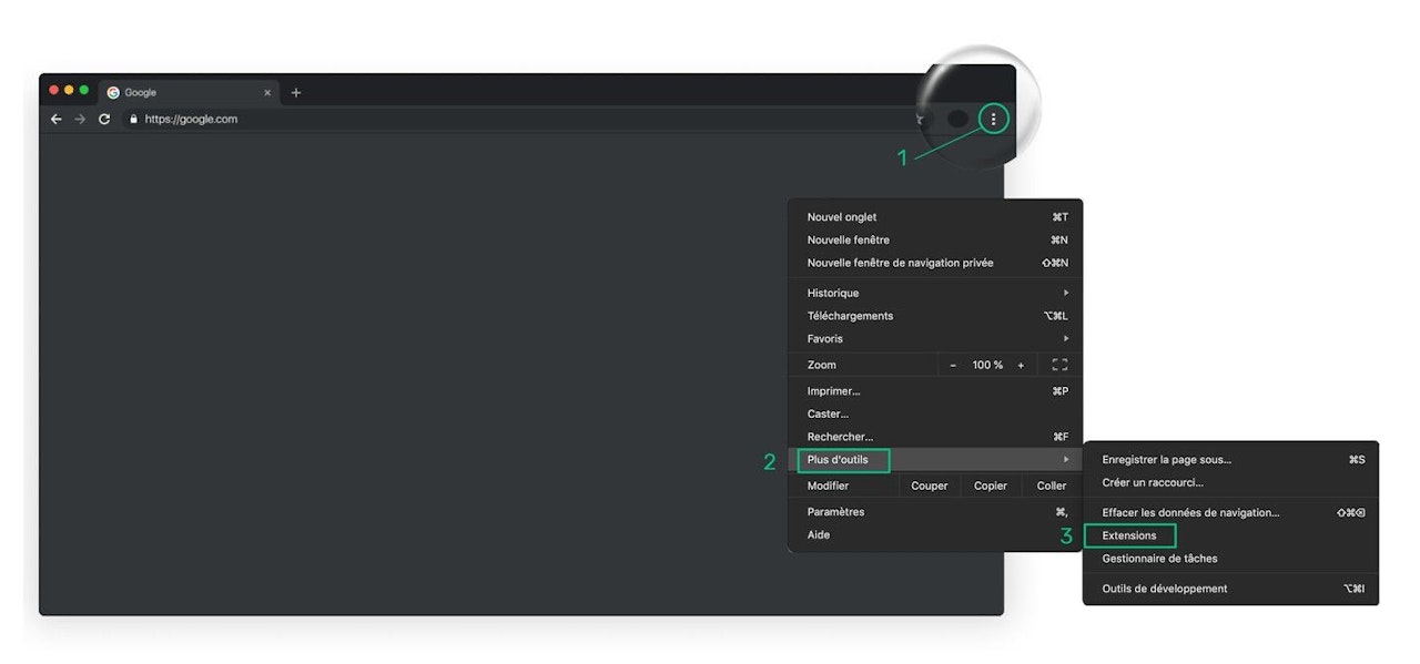 - Cliquez sur plus d'outils, puis cliquez sur l'onglet extensions