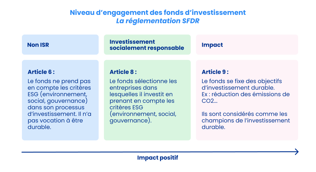La réglementation SFDR (Sustainable Finance Disclosures Regulation) est une réglementation de l’Union européenne, qui a défini trois types de fonds et qui impose aux acteurs de la finance de publier des informations sur la durabilité de leurs fonds d’investissement.