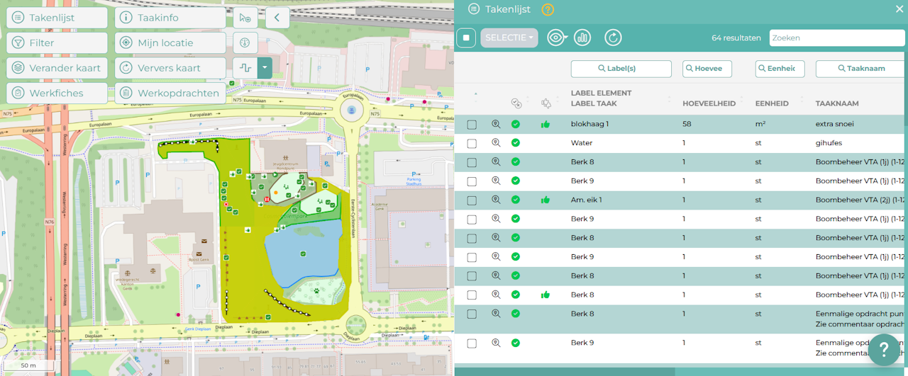 Taken: alle registraties die op een taak gebeuren (vb. klaar, veldnotitie, controle,...) worden bijgehouden en kan je gemakkelijk opvragen