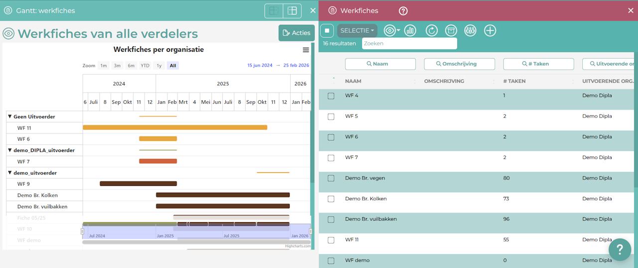 Hier worden taken doorgegeven aan de juiste externe organisatie of uitvoerder, kan je taken wijzigen (taaknaam, datum,...) bundelen.