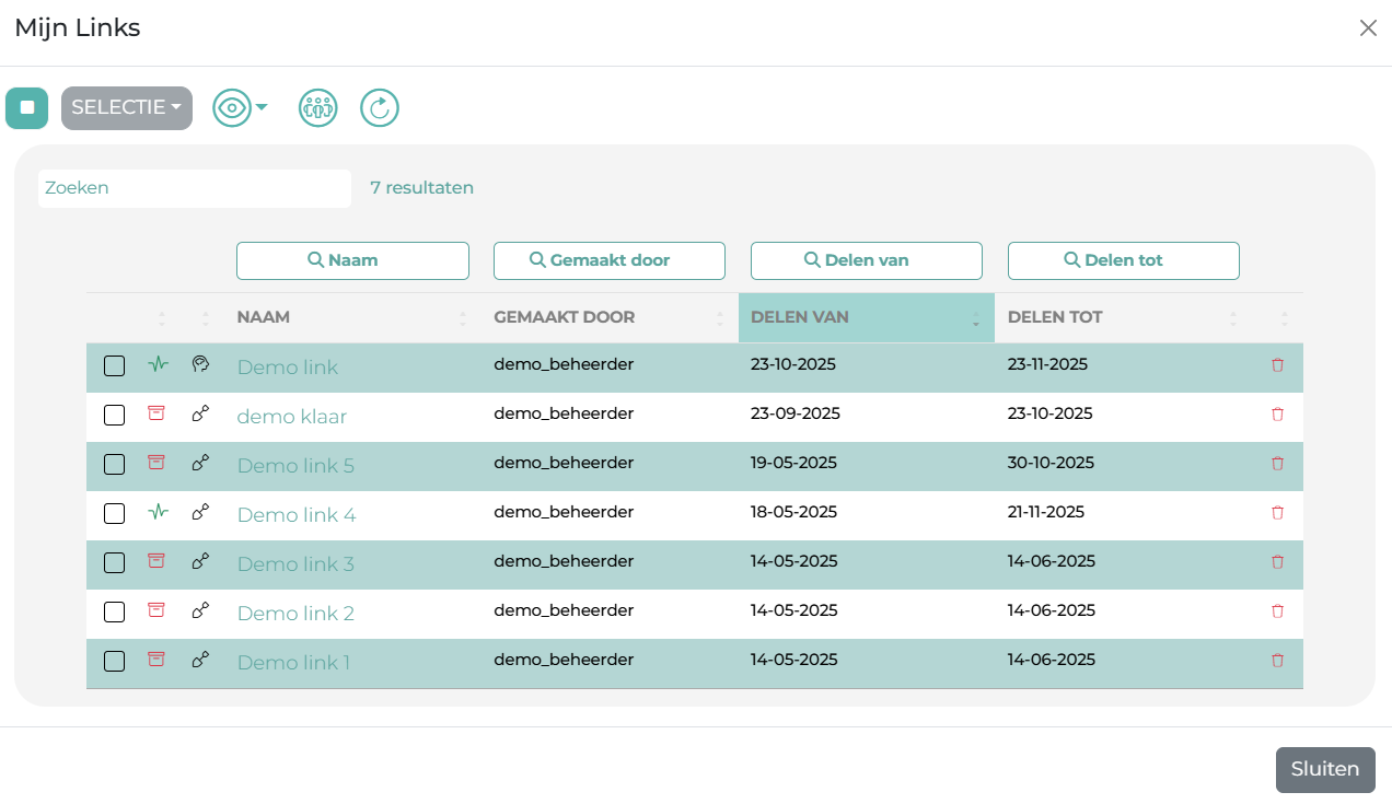 Taken filteren: taken kunnen gefilterd worden op naam, datum, taakstatus, controlestatus,...