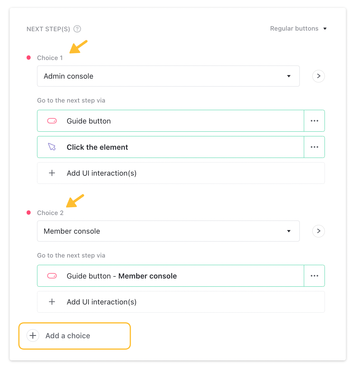 To create different paths for different scenarios or customer types, simply add choices inside the Next step(s) block.