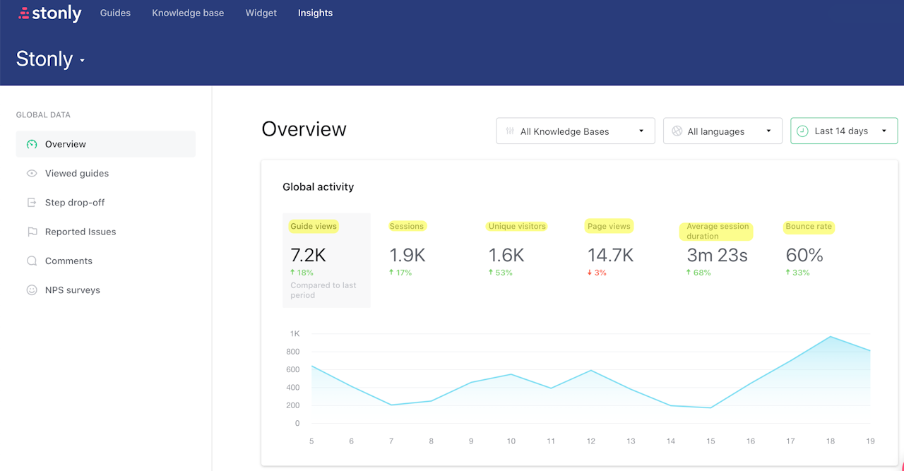 With Global Insights, you can track the overall performance of your content. You can pick a specific knowledge base to look into or view metrics for the entirety of your content, between all knowledge bases and standalone guides.