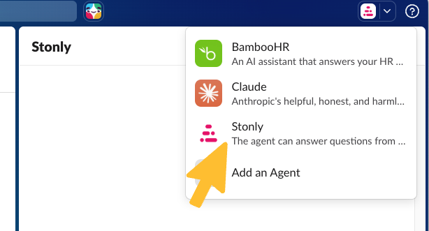 The Stonly Slack application allows you to benefit from AI answers features directly in Slack. There are two ways to ask questions to Stonly AI agents in Slack: