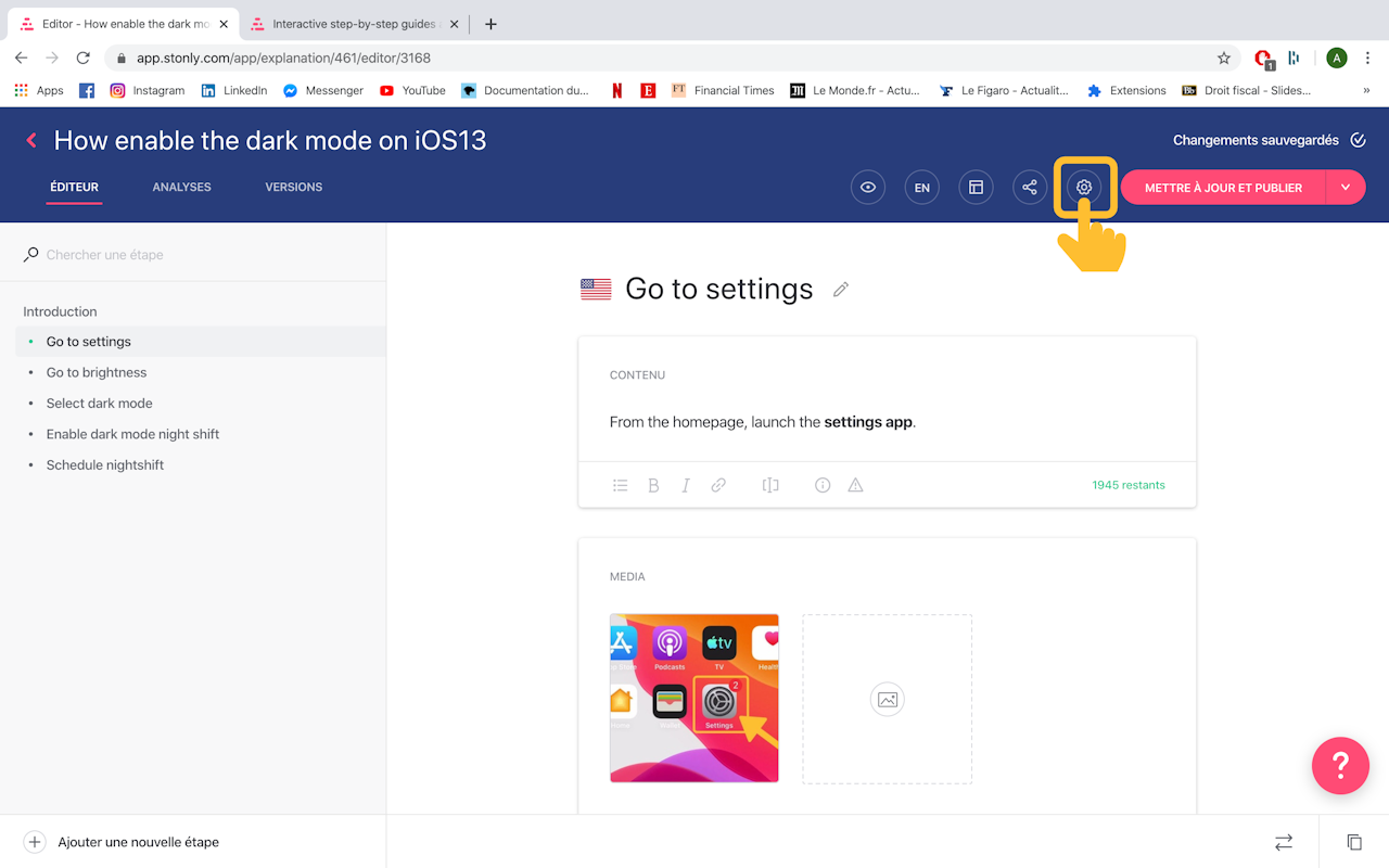 Cliquez sur l' icône Paramètres dans la barre d'outils en haut à droite.