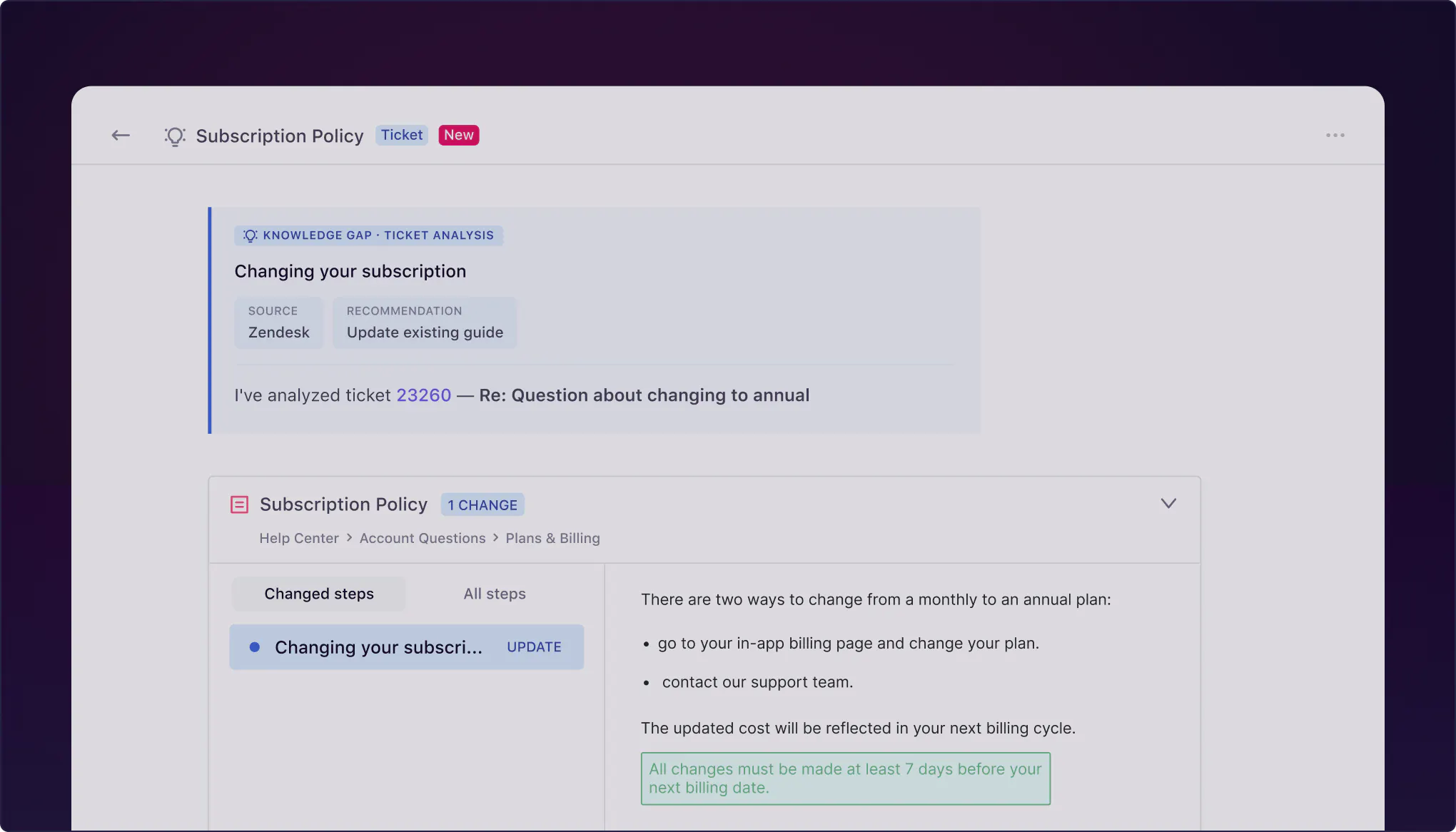 Plug in the places where change happens and questions come from. Knowledge Agents automatically check every support ticket that comes in, every search result and AI conversation and every change to your company's policies so nothing gets missed.Agents monitor knowledge health 24/7